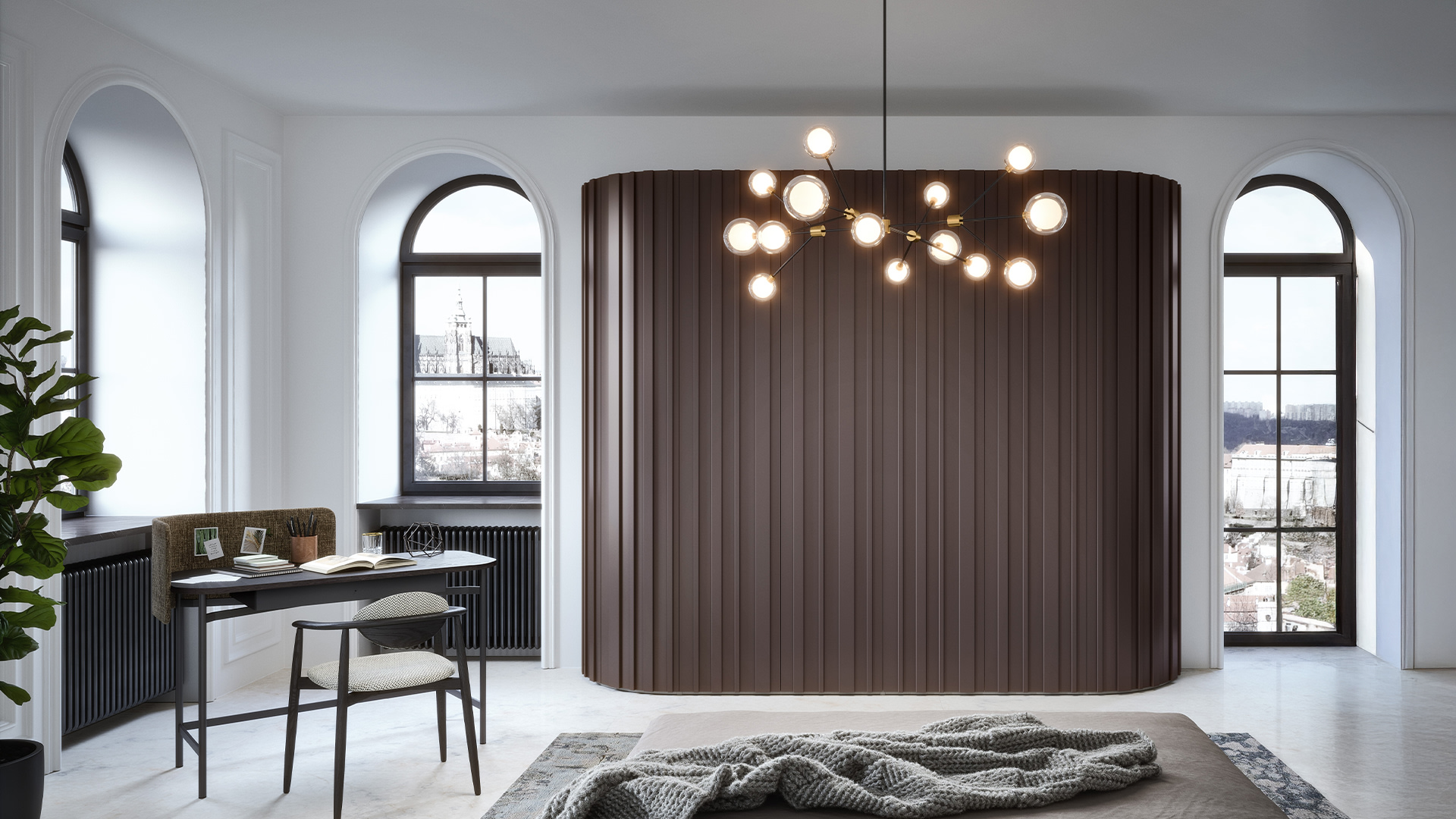 Die Türen mit senkrechten Streifen, die Grundelemente mit geschwungener Linienführung und die Tip-on-Öffnung sind nur einige der Elemente, welche die Einzigartigkeit des Schrankes mit Flügeltüren Stave ausmachen. Der Tip-on-Beschlag macht die Tür funktional, hochwertig und aus ästhetischer Sicht makellos. So wirkt der grifflose Schrank wie eine Wandtäfelung. Stave lässt sich aus diesem Grund hervorragend als Trennwand zwischen zwei Räumen einsetzen.